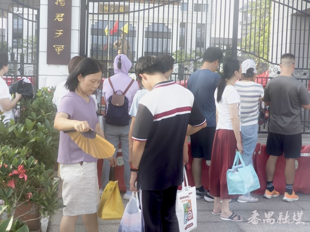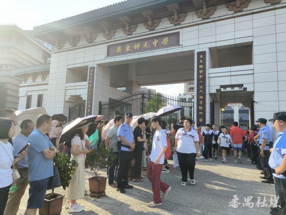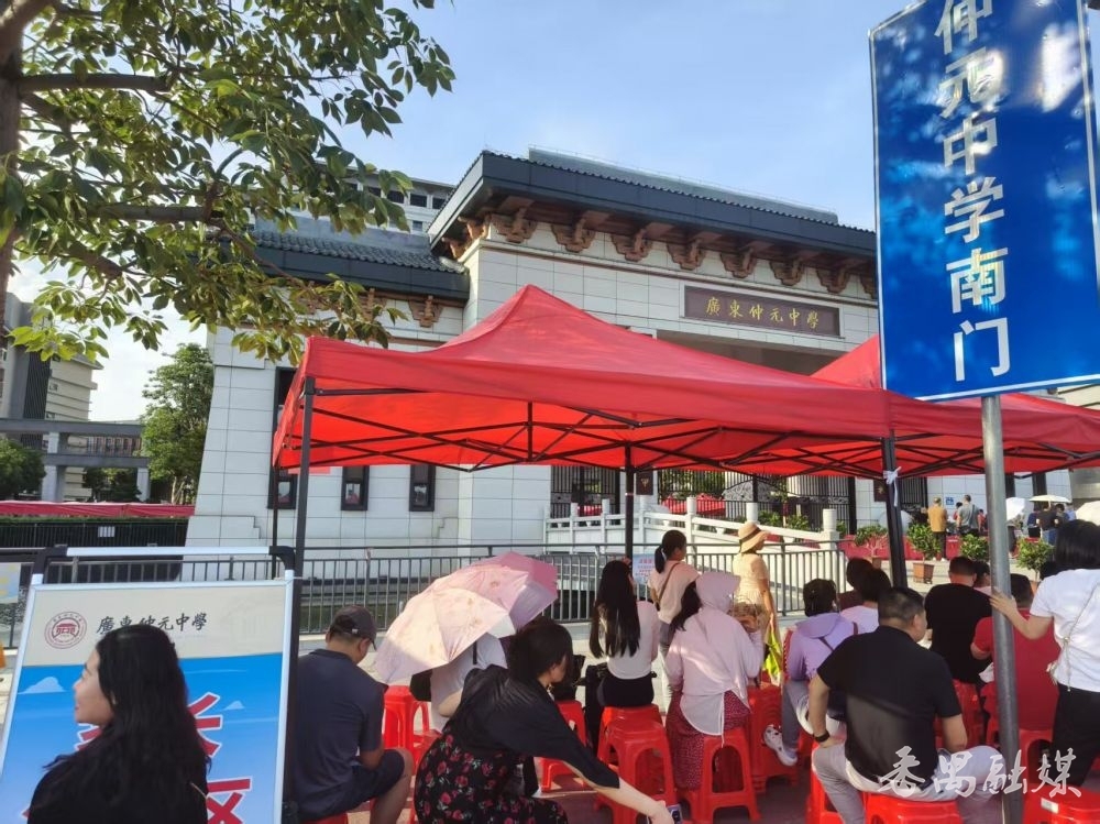 16点30分,距离当天最后一科(英语)考试结束尚有半小时,广东仲元中学考点外的遮阳棚下及周边树荫里,已经聚集了不少翘首以盼的家长。天气炎热,家长们纷纷手持扇子驱散暑气。